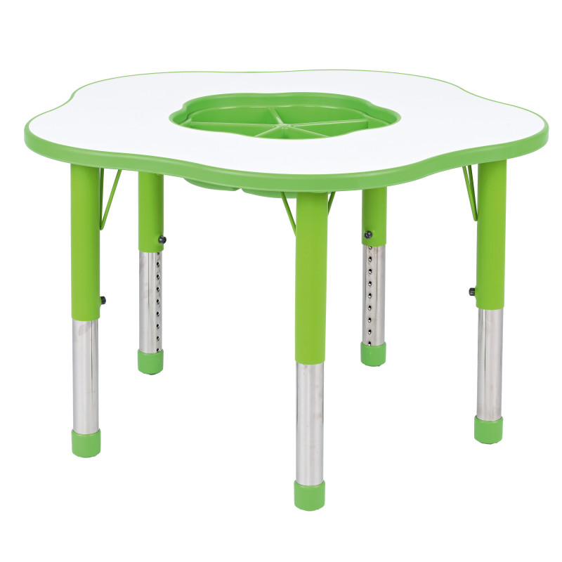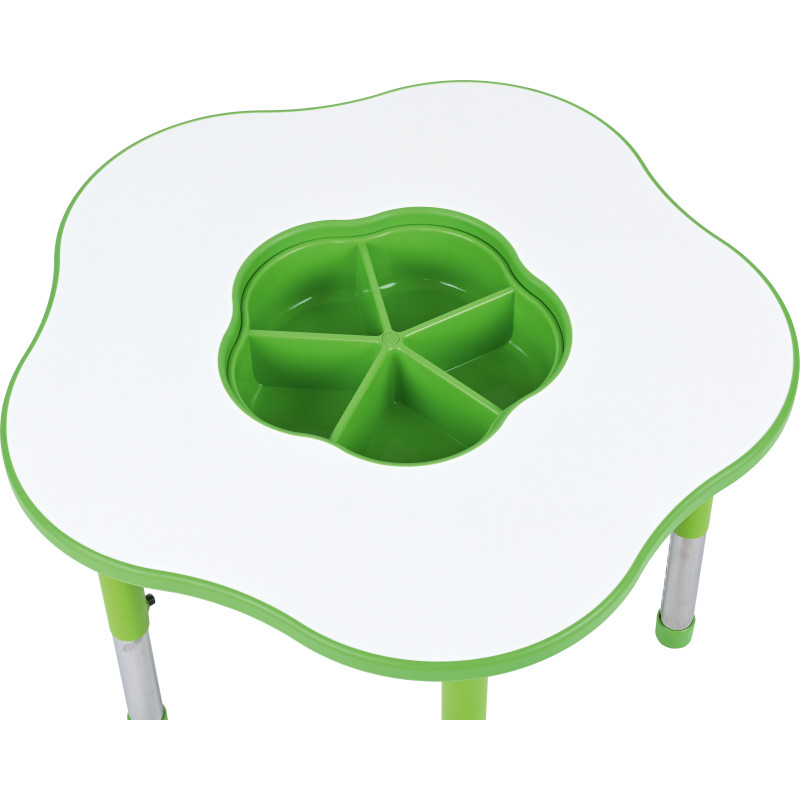 Stabilios plieninės kojos užtikrina saugumą ir tvirtumą, o reguliuojamas aukštis leidžia lengvai pritaikyti staliuką skirtingo amžiaus vaikams. Staliuko centre įmontuotas patogus išimamas organizatorius, skirtas laikyti pieštukus, flomasterius ar kitas priemones – tai padeda palaikyti tvarką ir palengvina priežiūrą.