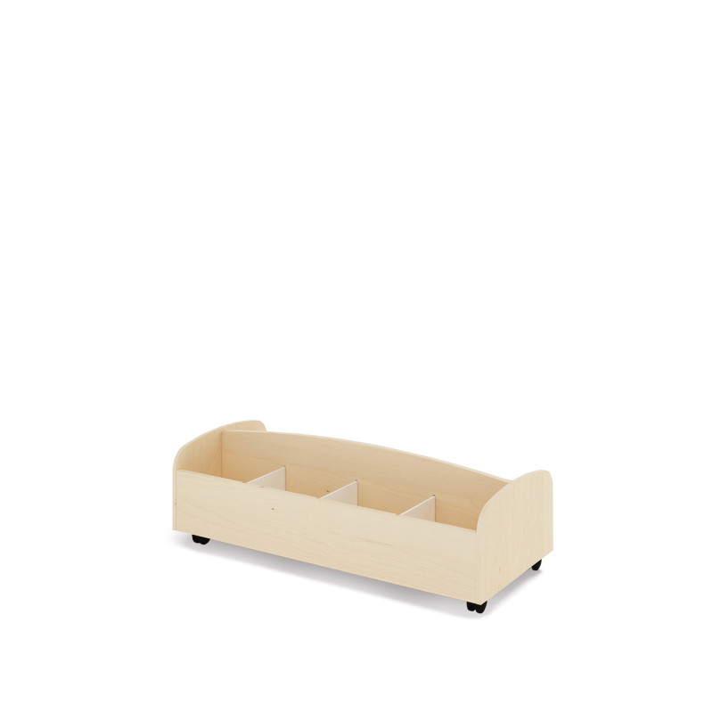 Mobili dvipusė daiktadėžė idealiai tinka knygoms ir aksesuarams laikyti. Konstrukcija pagaminta iš beržo spalvos medžio drožlių plokštės, su pertvara kreminio atspalvio, kuri suteikia papildomo funkcionalumo. Baldas turi tris baltas, reguliuojamo aukščio lentynas, pagamintas iš MDF plokštės, leidžiančias pritaikyti erdvę pagal poreikius. Stabilumą ir mobilumą užtikrina keturi ratukai bei mažesnė šoninė dalis, pagaminta iš MDF plokštės.