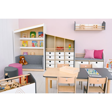 Jaukus ir funkcionalus knygų laikymo ir skaitymo kampelis. Spintelėje įrengtos dvi talpios lentynos, kuriose patogu eksponuoti vaikučių mėgstamiausias knygutes.