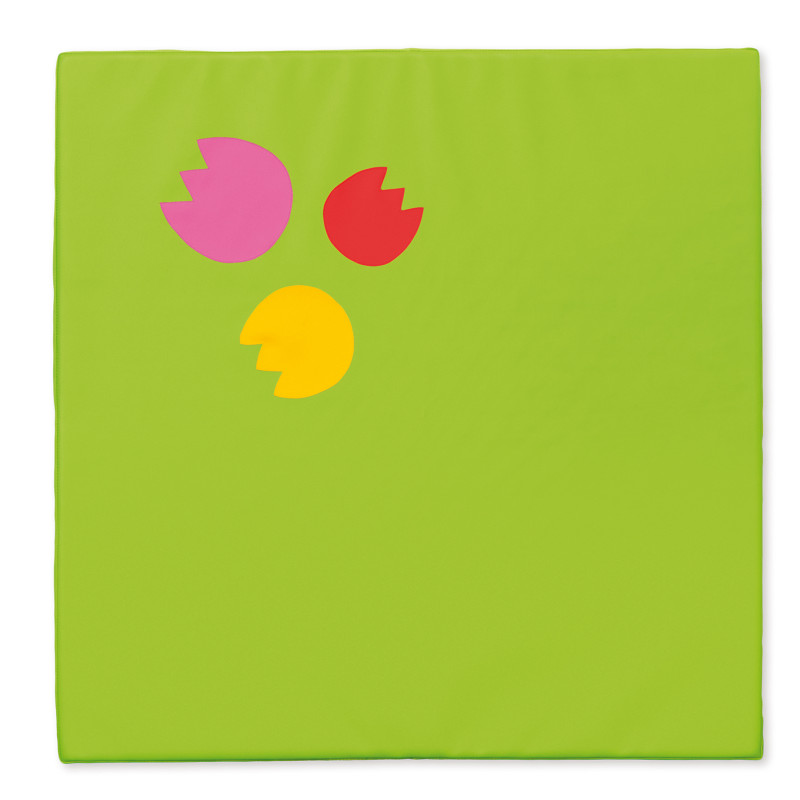 Žalios spalvos kvadratinis čiužinys su pavasario motyvo aplikacijomis, padengtas PCV audiniu be ftalatų, atspariu dilimui, ir užpildytas didelio elastingumo poliuretano putomis, yra išskirtinė priemonė terapijai, reabilitacijai bei stiprinamiesiems pratimams.