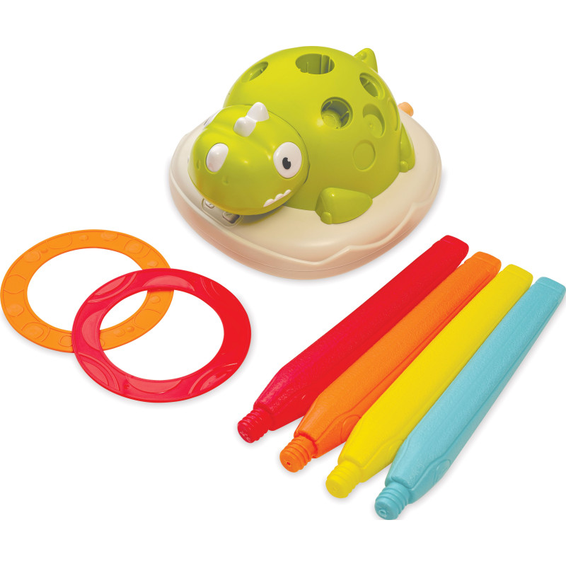 Rinkinį sudaro: dinozauro formos pagrindas, rankų stabilizatorius, 2 žiedai ir 4 rankos