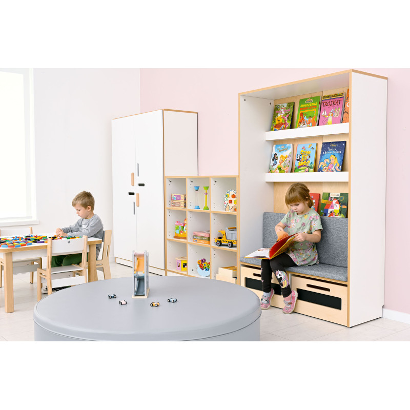 Jaukus ir funkcionalus knygų laikymo ir skaitymo kampelis. Spintelėje įrengtos trys talpios lentynos, kuriose patogu eksponuoti vaikučių mėgstamiausias knygutes. Spintelės apačioje dvi talpios daiktadėžės.